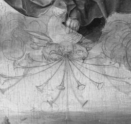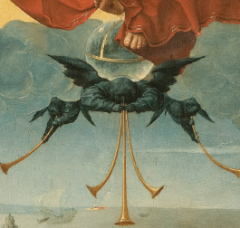 圖 4b: 相比較畫(huà)中實(shí)際所畫(huà)的5個(gè)喇叭,可以看到近紅外成像中有10個(gè)喇叭在大天使之下。畫(huà)中喇叭的位置似乎需要一個(gè)重新定位的帆船。地球儀上的腳趾的位置也與原始草圖的位置不同。圖像版權(quán)所有 by Detroit Institute of Arts。經(jīng)允許使用。
