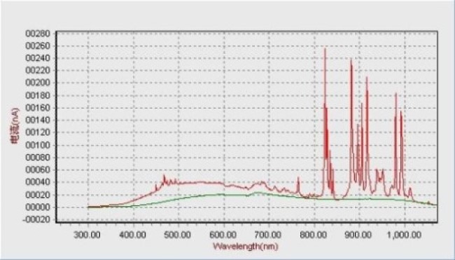 下圖是150W氙燈(8.5A)和250W鎢燈(10A)的單色光能量對(duì)比圖,測(cè)試配合SR540斬波器,采用HISW301光譜儀(光柵型號(hào):HOG1200-300,狹縫寬度:0.2mm)和HIFW6濾光片輪;掃描范圍:300nm-1100nm;掃描步距:1nm;采用HID230硅探測(cè)器進(jìn)行光電轉(zhuǎn)換,SR830鎖相放大器進(jìn)行數(shù)據(jù)采集。