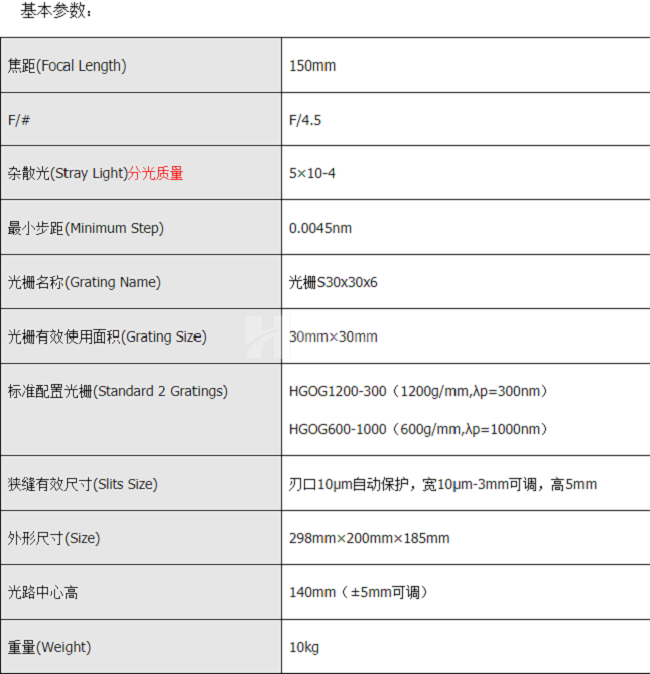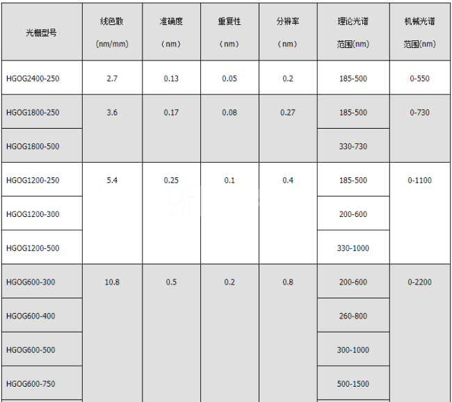 HGISW / HGISU系列單色儀/光譜儀光柵與技術(shù)指標(biāo)對(duì)照表