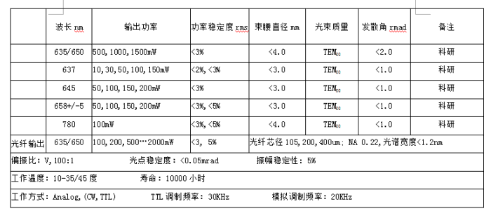 注:不同波長(zhǎng)和功率的激光器價(jià)格也是不同,歡迎可以對(duì)照下面的參數(shù)表咨詢客服。