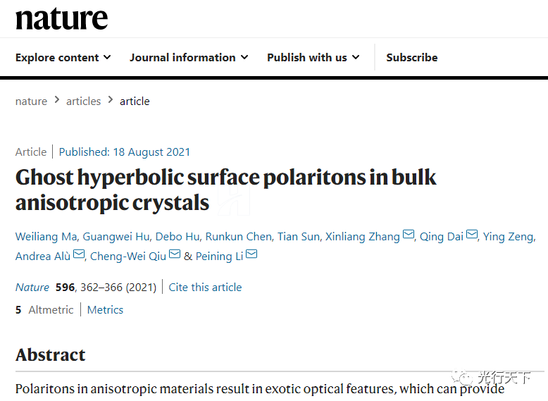 近日,國際頂級期刊《自然》刊發(fā)了華中科技大學(xué)武漢國家光電研究中心/光學(xué)與電子信息學(xué)院李培寧教授和張新亮教授研究團(tuán)隊題為《Ghost hyperbolic surface polaritons in bulk anisotropic crystals》的研究論文。李培寧、張新亮教授團(tuán)隊同新加坡國立大學(xué)、國家納米科學(xué)中心、紐約州立大學(xué)等單位合作,突破性證明了傳統(tǒng)的雙折射晶體中存在“幽靈”雙曲極化激元電磁波,該成果革新了極化激元基礎(chǔ)物理的“教科書”定義,對凝聚態(tài)物理、光物理、電磁學(xué)等領(lǐng)域的基礎(chǔ)原創(chuàng)研究具有重要指導(dǎo)意義。