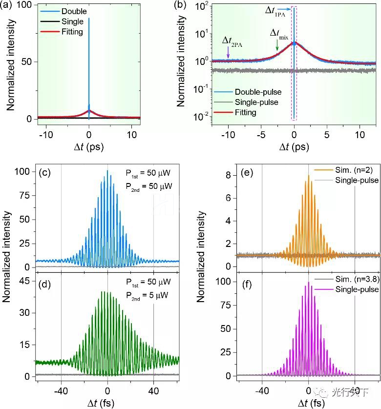圖1 金納米粒子在不同時間尺度下的超快動力學(xué)行為。(a)線性坐標(biāo);(b)對數(shù)坐標(biāo)。(c)兩束等功率飛秒脈沖激發(fā)下的對稱干涉條紋;(d)不等功率激發(fā)下的非對稱干涉條紋。傳統(tǒng)多光子激發(fā)效果模擬:(e) n =2,(f) n =3.8。