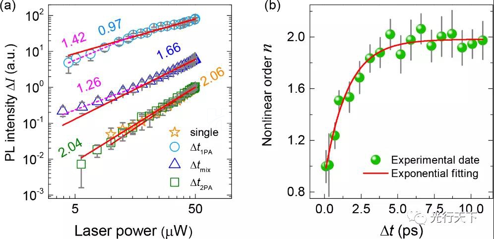 研究工作同時表明,通過精確調(diào)控兩束飛秒激光的延遲,可以精準(zhǔn)地調(diào)控飛秒激光與金納米粒子相互作用的非線性系數(shù)。如 圖2所示,使用單束飛秒脈沖激發(fā)金納米粒子時,其熒光表現(xiàn)出明顯的雙光子吸收過程,非線性系數(shù)為2;在采用雙脈沖激發(fā)時,當(dāng)僅改變其中一束飛秒激光功率時,金納米粒子的熒光隨兩束脈沖延遲的增加呈現(xiàn)出從線性過程向雙光子過程漸變的奇異行為。在金納米粒子的實(shí)際應(yīng)用中,線性過程更適用于精密測量與傳感,而高階非線性過程對超分辨成像更有利。