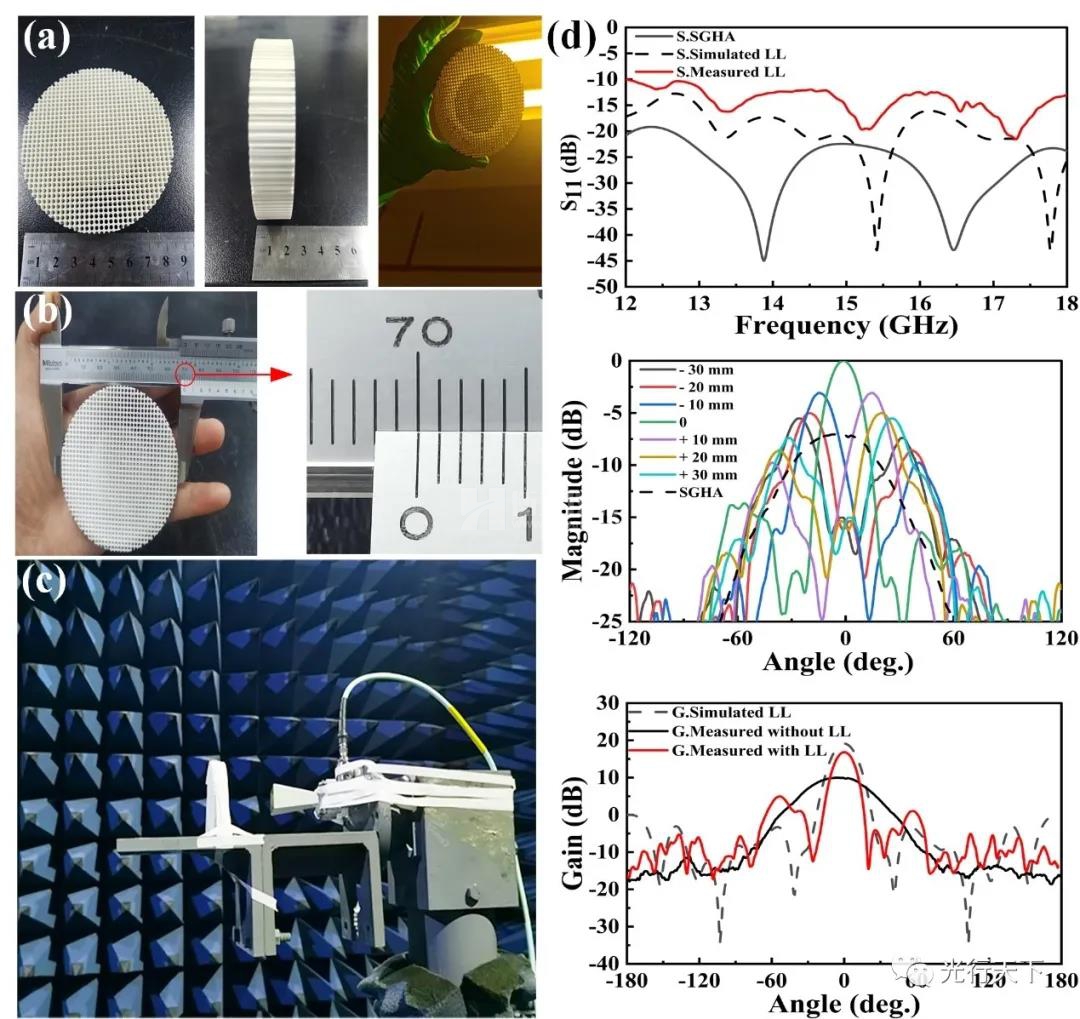 本論文通過引入超材料結構,實現(xiàn)了高介電常數(shù)陶瓷介質(zhì)的梯度分布,并結合轉換光學理論,采用SLA紫外光固化3D打印工藝制備,制備獲得了一種低剖面結構的龍勃透鏡。該透鏡天線燒結溫度低(850°C燒結成型)、成型精度高(凈尺寸與設計尺寸幾乎一致)、厚度?。s10mm),在Ku波段實現(xiàn)了±15°的波束掃描,對饋源的增益提升超過5 dBi。該工作為復雜結構微波/射頻器件一體化成型提供了新思路,有利于推進低成本陶瓷微波/射頻組件的開發(fā)與制備。