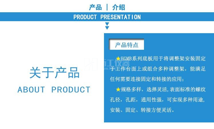 HGMB系列底板適用于將調(diào)整架安裝固定于工作臺(tái)面上或組合多種調(diào)整架,能滿足任何需要連接固定和轉(zhuǎn)接的應(yīng)用。