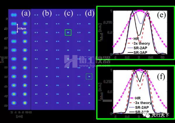 (a)衍射極限下的HR圖像、(b)3倍理論SR圖像、(c)2孔徑訓(xùn)練策略SR外推結(jié)果、(d)3孔徑訓(xùn)練策略SR外推結(jié)果、(e)和(f)為相應(yīng)的2.2倍和2.7倍SR時(shí)的橫截線(xiàn)對(duì)比圖。0.735為Rayleigh criterion下歸一化鞍點(diǎn)強(qiáng)度